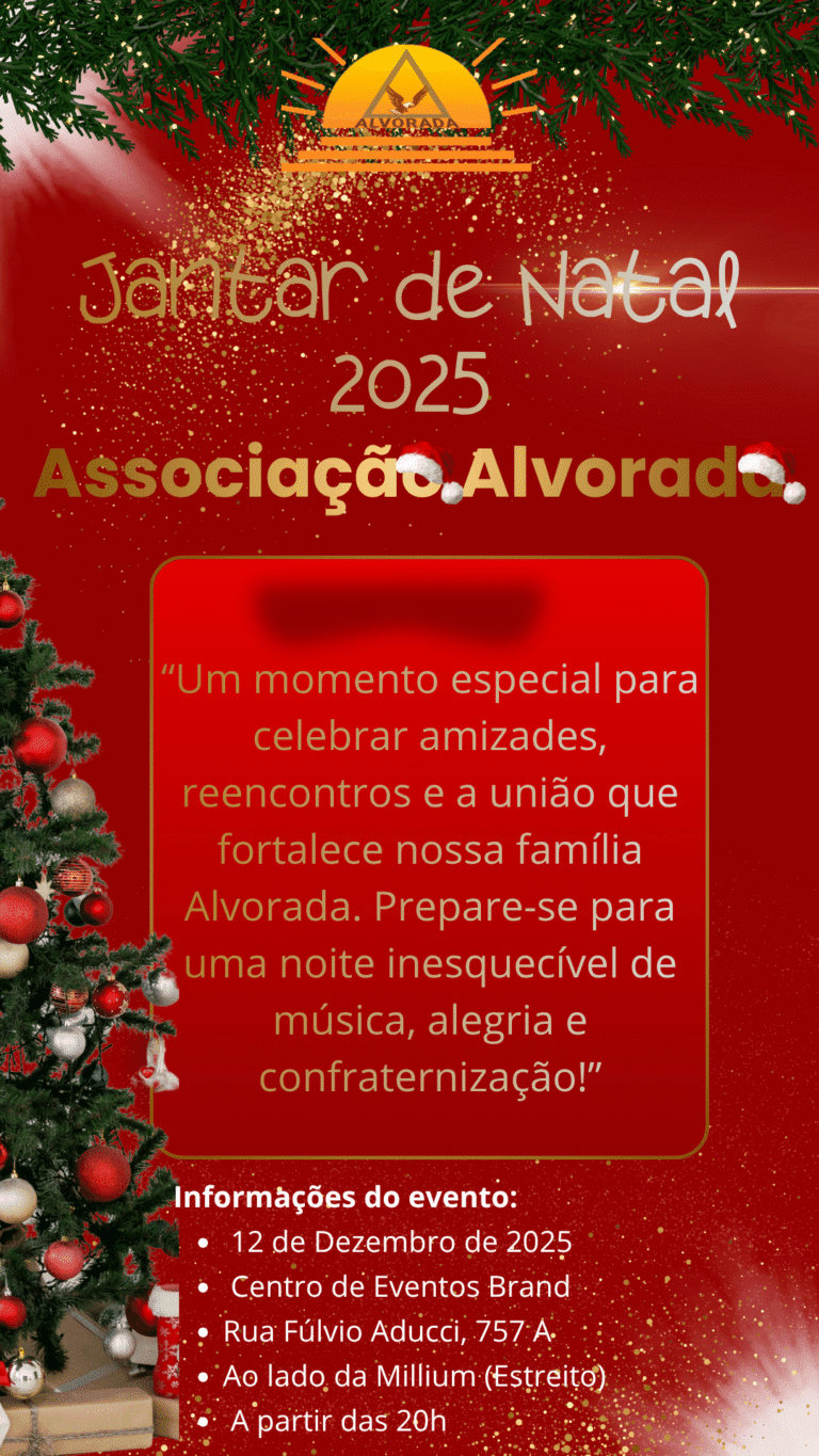 A Diretoria Executiva da Gestão 2024/2027 tem a honra de convidar seus associados e associadas para participarem deste evento especial, que será realizado no dia 12 de Dezembro de 2025, a partir das 20h, no Centro de Eventos Brand, localizado na Rua Fúlvio Aducci, 757 A, ao lado da Millium.